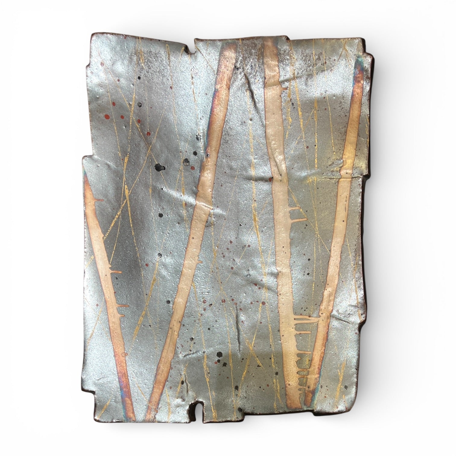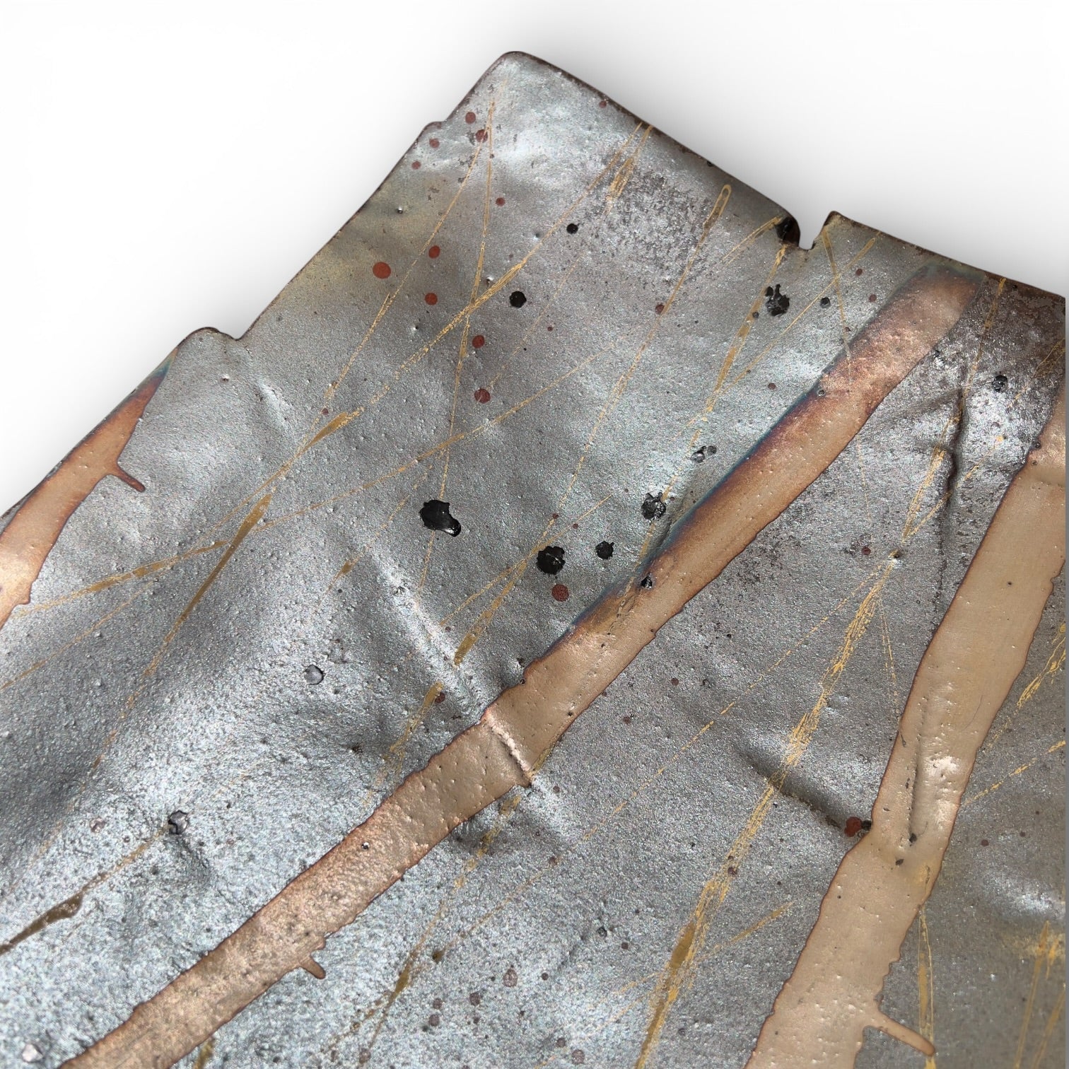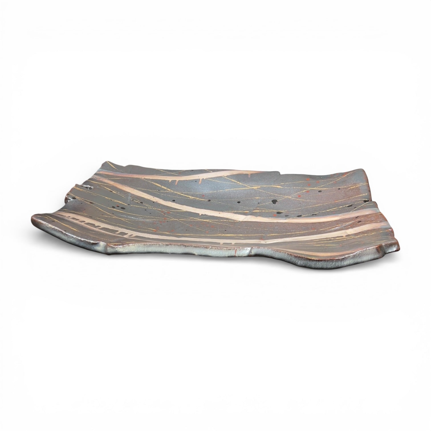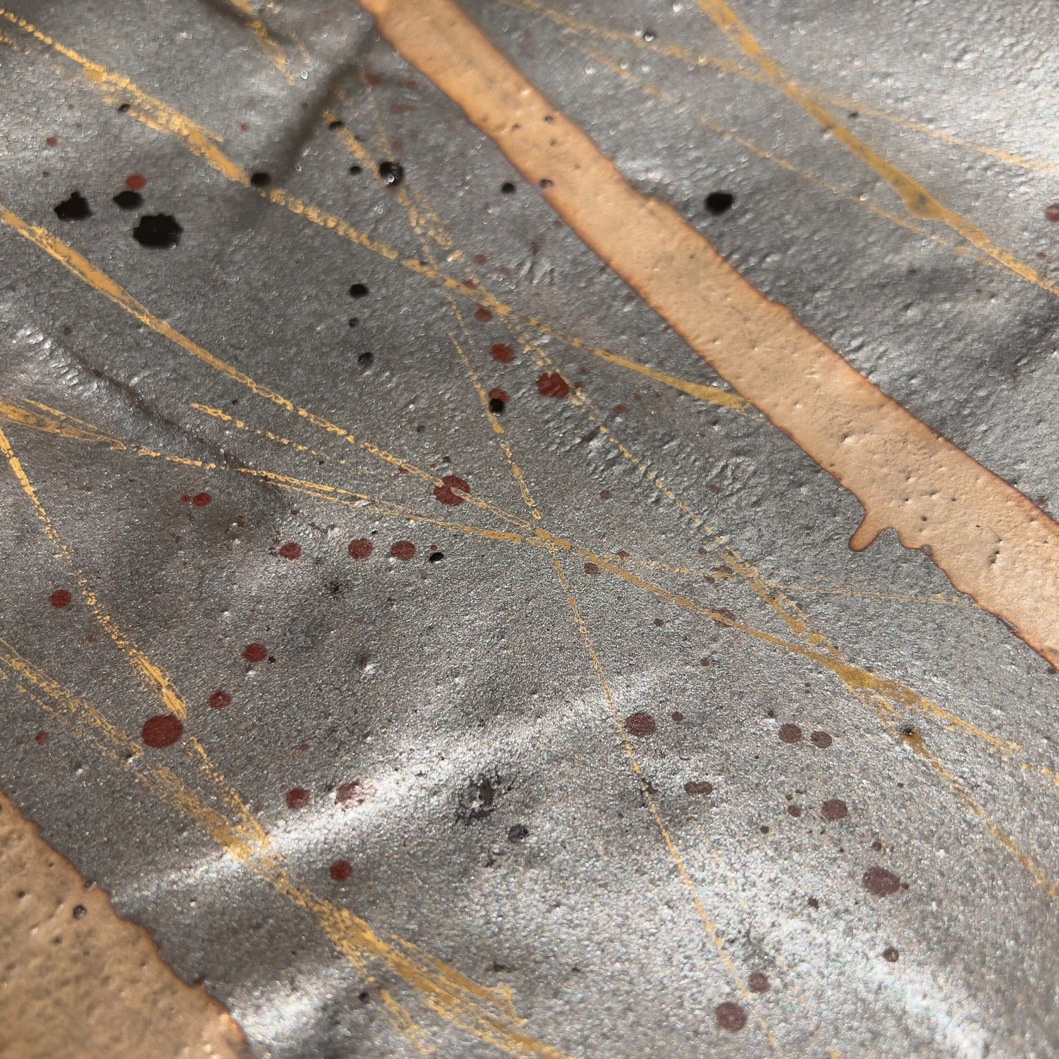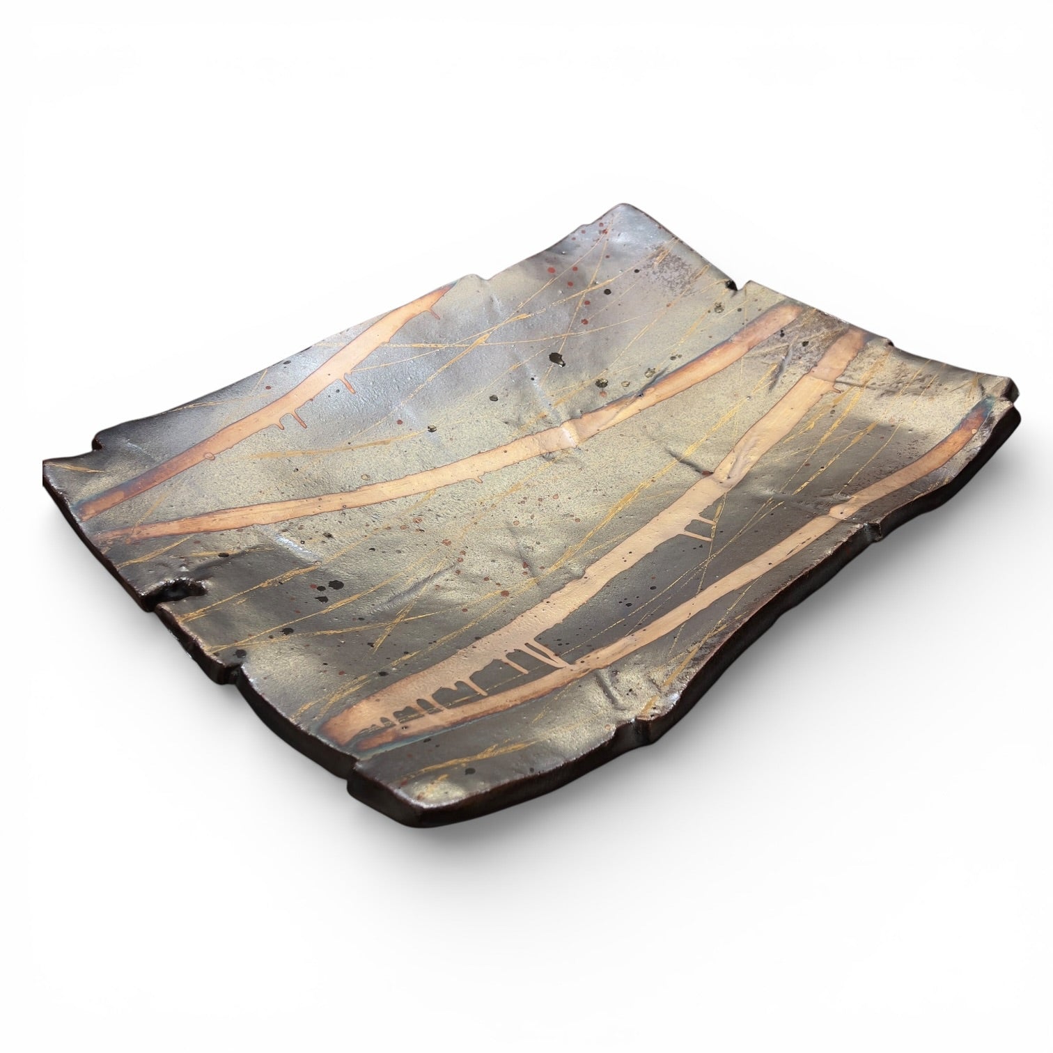 Des lignes fines et nerveuses, dorées et mordorées, traversent le plat en diagonale dans des directions multiples, jouant avec les bandes claires et les zones sombres pour créer un effet de lumière tissée, de vibration textile transposée en céramique. Des éclaboussures et points de cuisson naturels ajoutent leur propre ponctuation au tableau.
