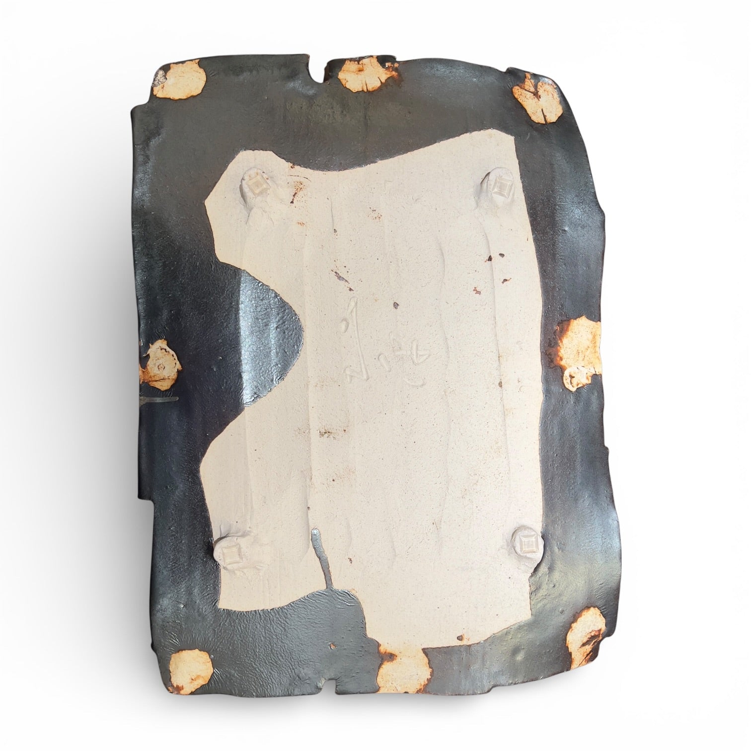 Le plat présente une forme rectangulaire à bords découpés et irréguliers, typique du style expressif de Tsuboshima, qui traite la plaque d'argile comme une toile vivante. Les quatre bords sont librement incisés et légèrement ondulés, conférant à l'objet une énergie organique qui refuse toute rigidité géométrique. La pièce repose sur quatre petits pieds discrets, selon la tradition des plats de service de haut rang.